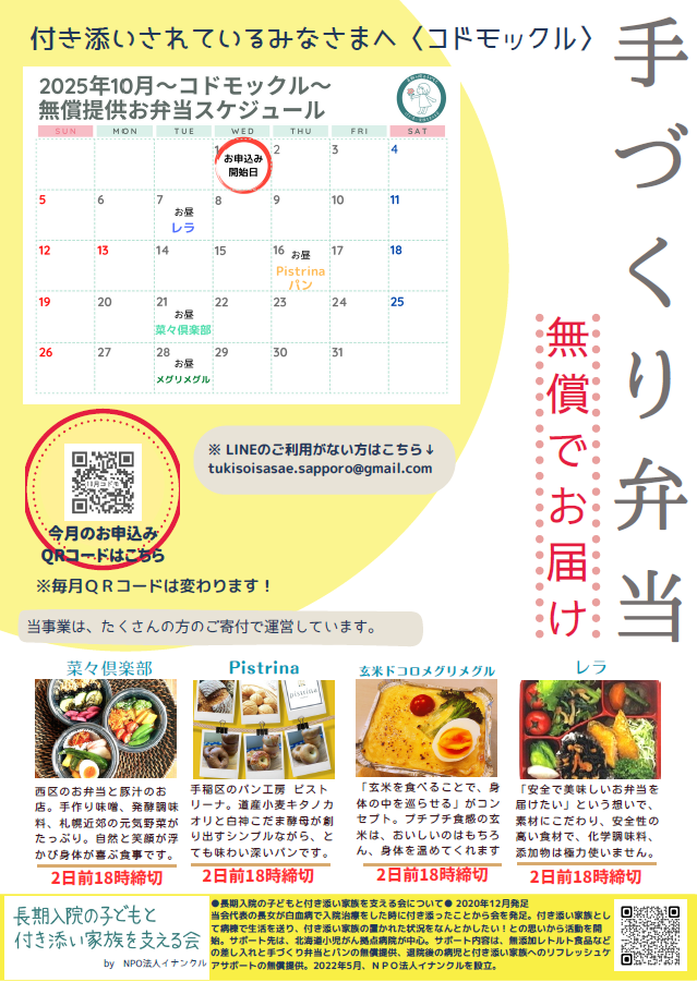 NPO法人イナンクルが無償でお子さまに付き添いされるご家族さまに提供をしております付添食(お弁当)について、10月のスケジュールをお知らせします。